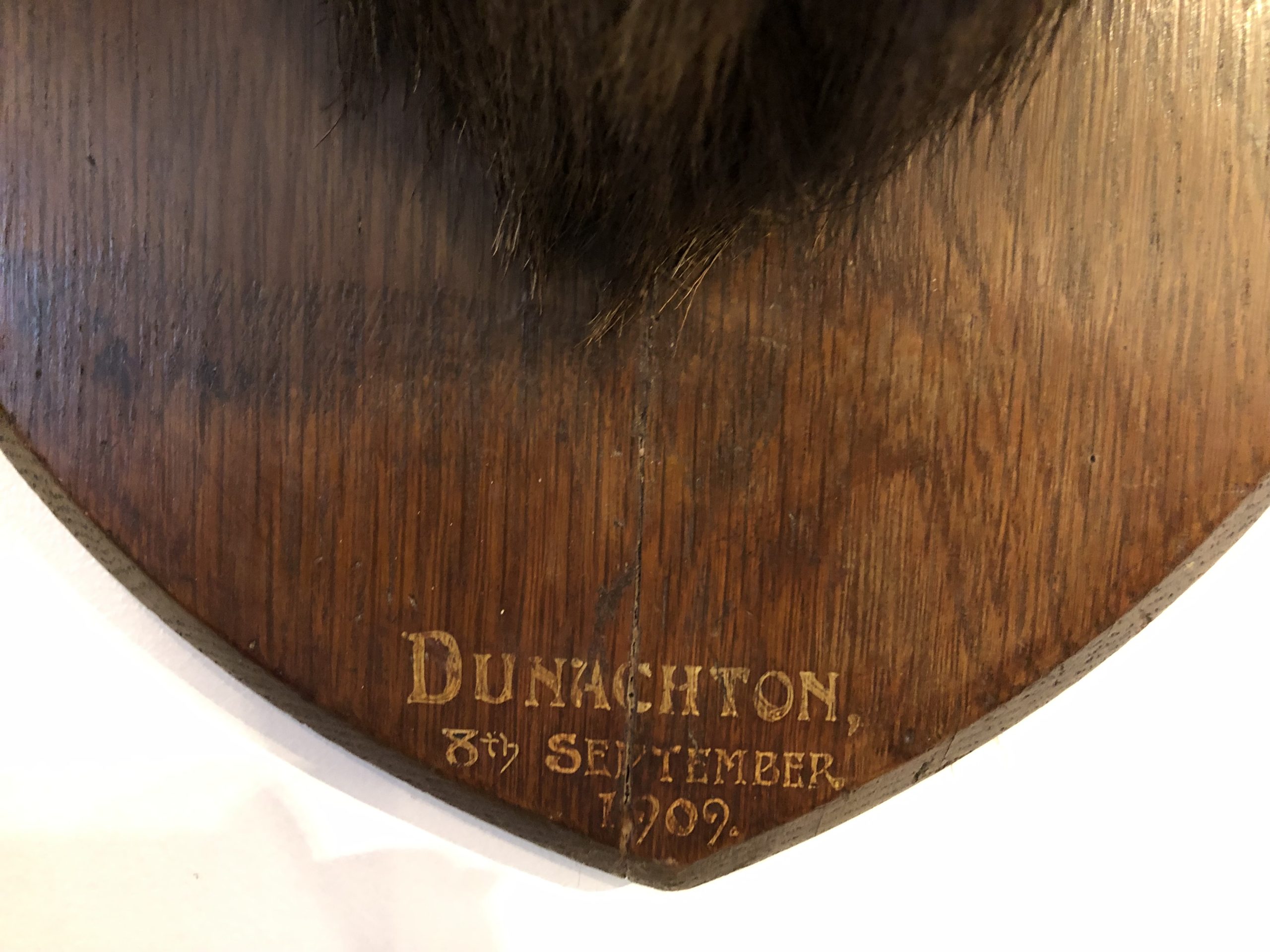 SOLD. An 8 point red stag, shot and mounted in the Scottish Highlands, on the Dunachton Estate in the Cairngorms, near Aviemore on the 8th of September 1909.