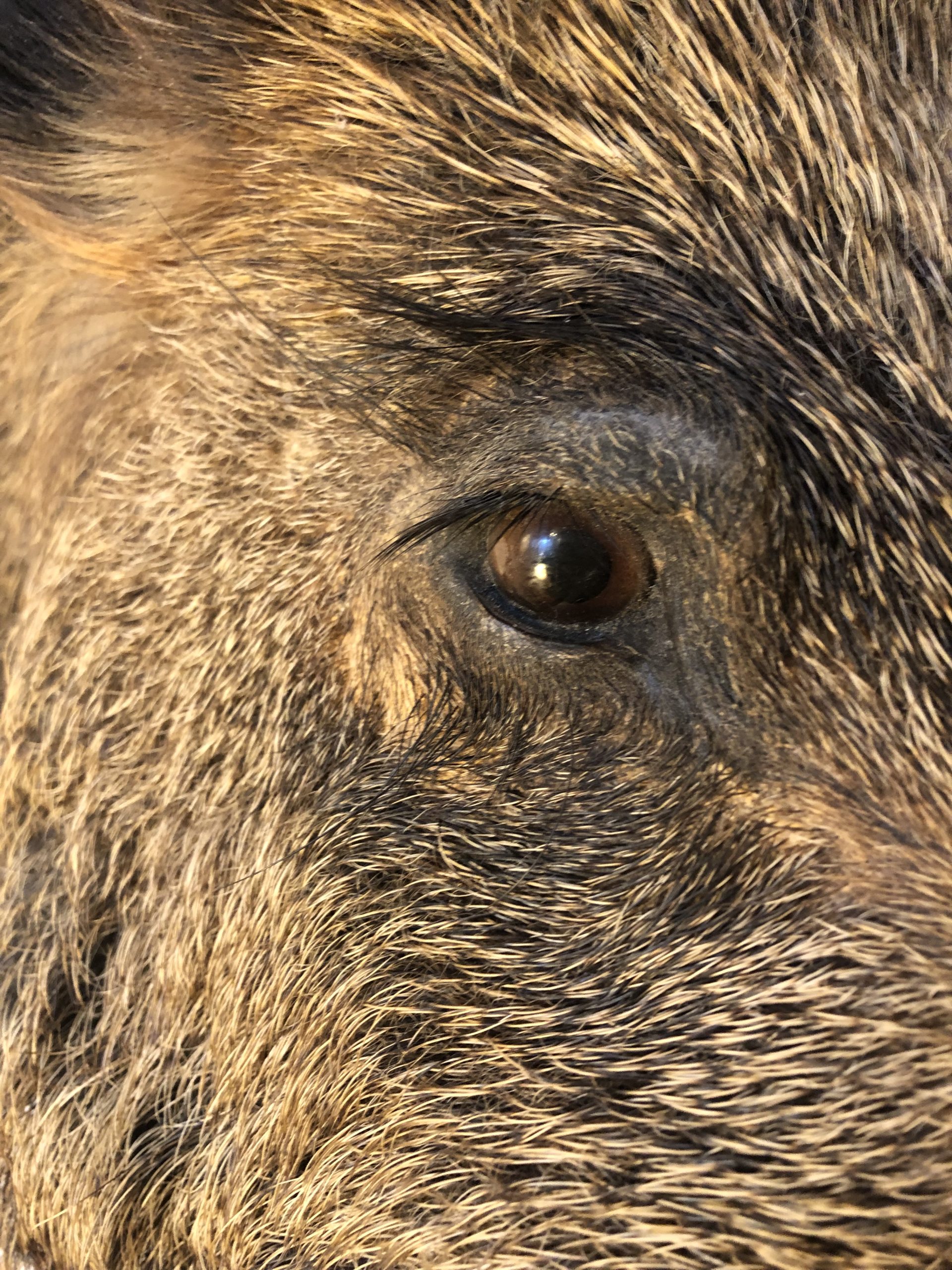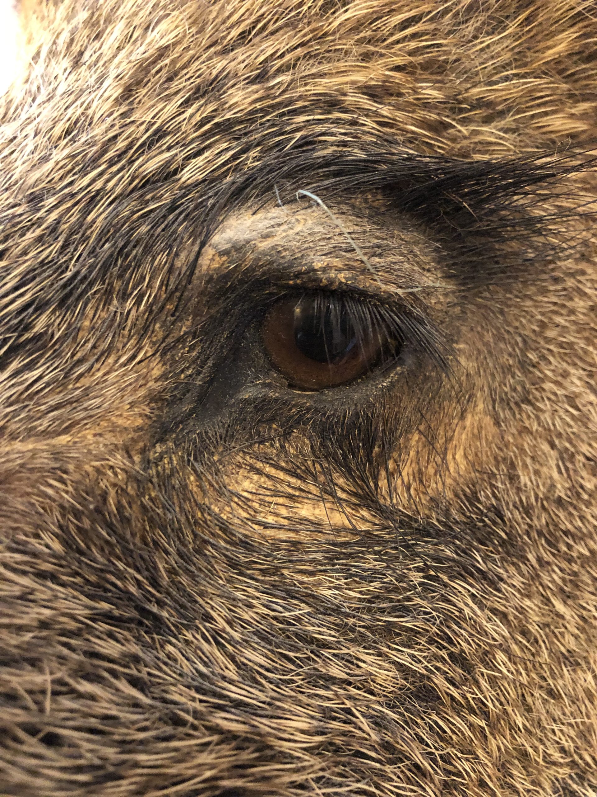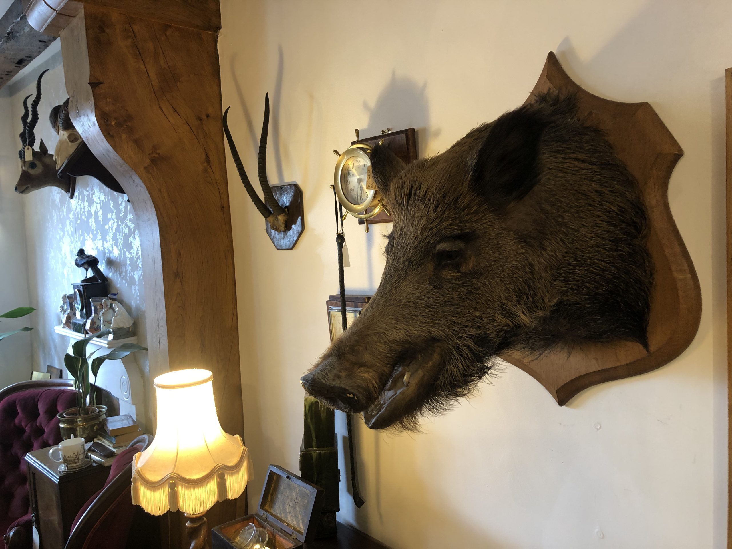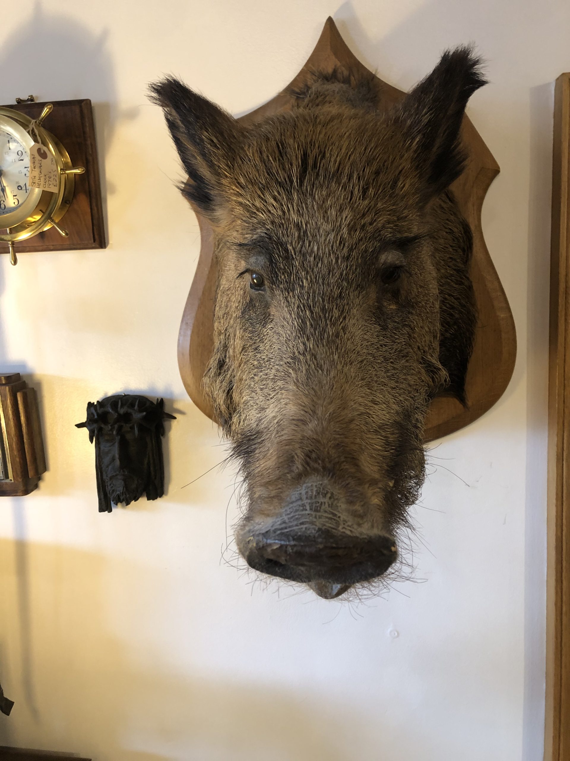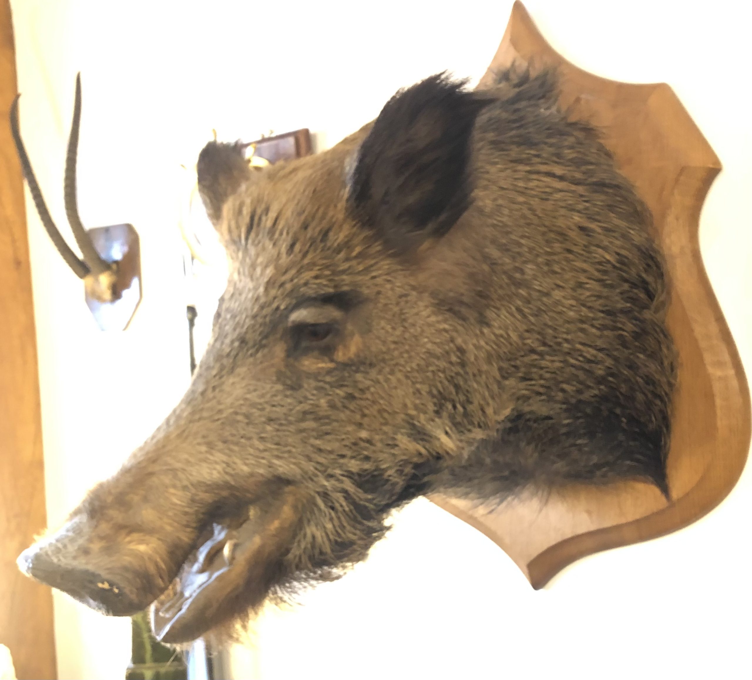 A very handsome boar’s head.Given that the piece is lighter in weight than an equivalent Victorian example, along with light, but nonetheless, age related wear. suggests that it was mounted onto its traditional light oak shield in the middle part of the 20th century.