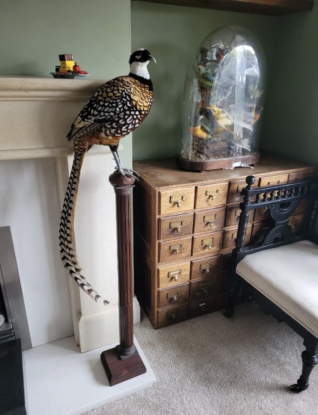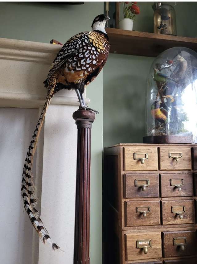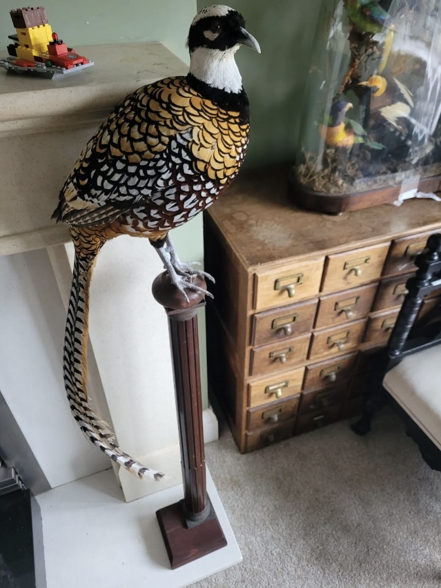 | SOLD – ANOTHER SIMILAR BIRD AVAILABLE – IMAGES & DESCRIPTION TO FOLLOW A stunning Reeves Pheasant presented atop a reclaimed antique wooden column. Phasianus colchicus Not endangered, protected or listed in anyway, and perfectly OK to sell within the UK. A well presented bird, in great condition. An imposing addition to existing collection or as a stand alone piece. Free tracked delivery included free of charge. International shipping available. |