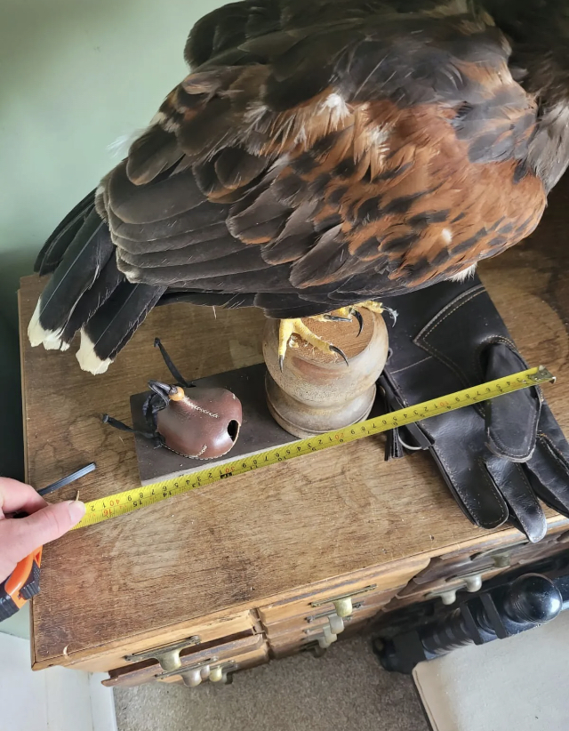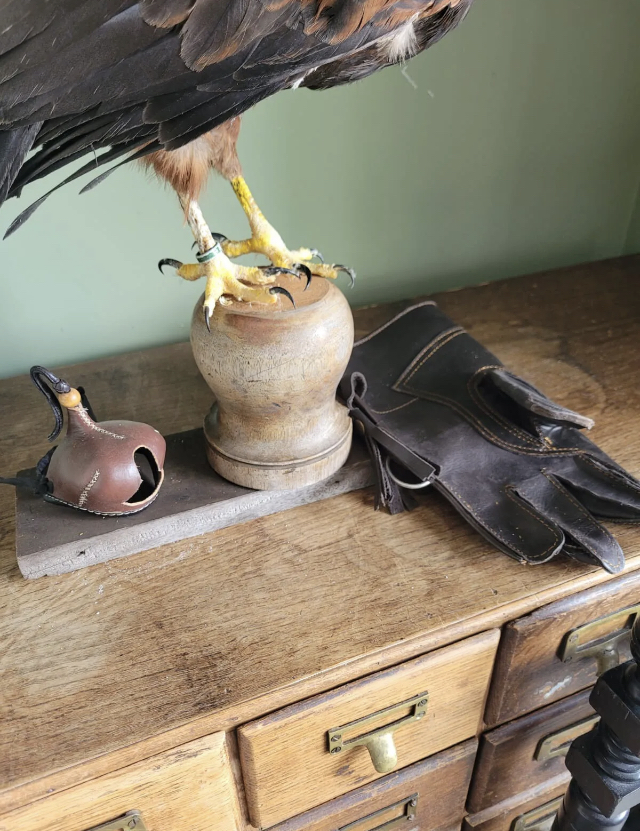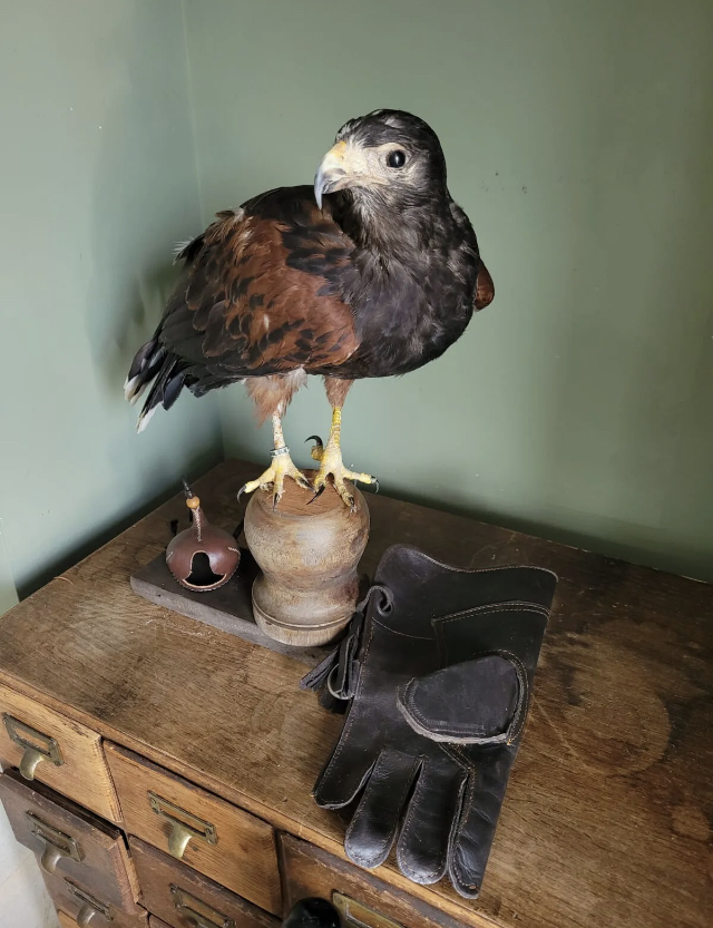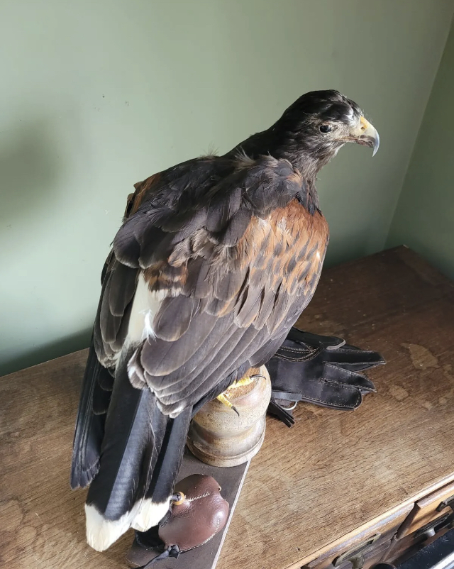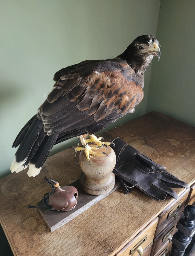 Unusual Savannah Hawk (Buteogallus Meridionalis) arranged astride a falconers glove and hood.